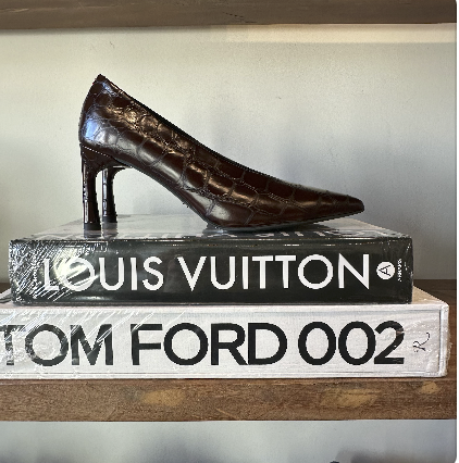 Beautifully crafted pump in brown embossed croc leather. Perfect 3 inch curved heel design for maximum comfort.
